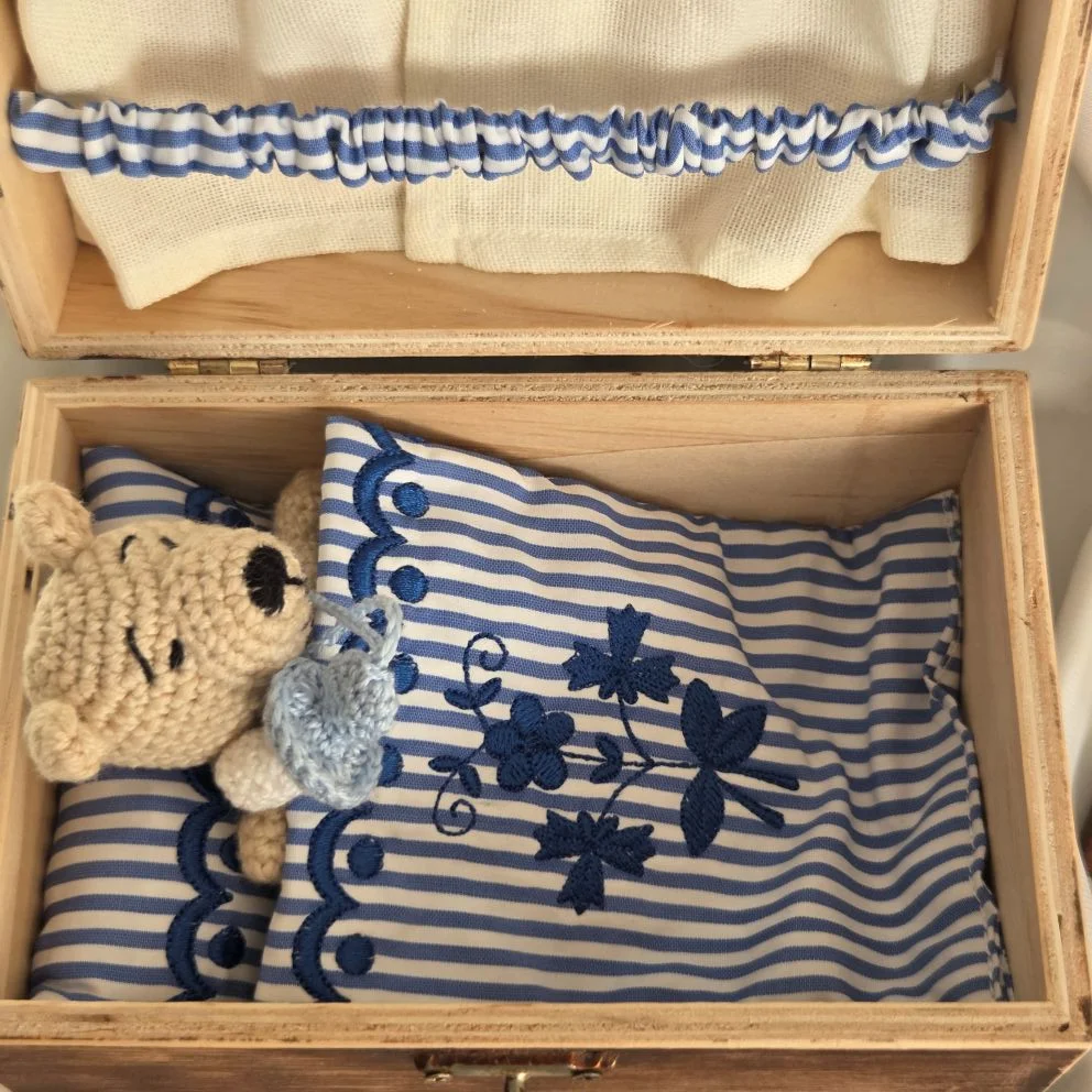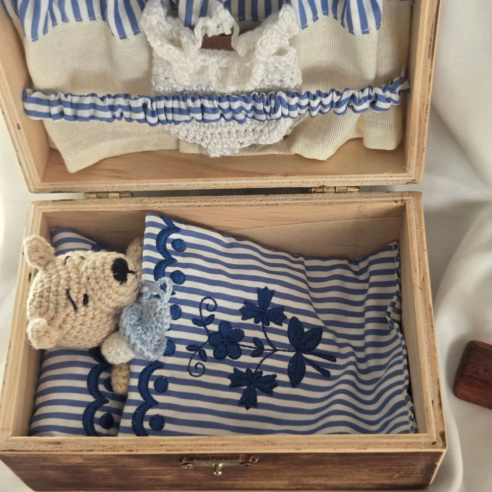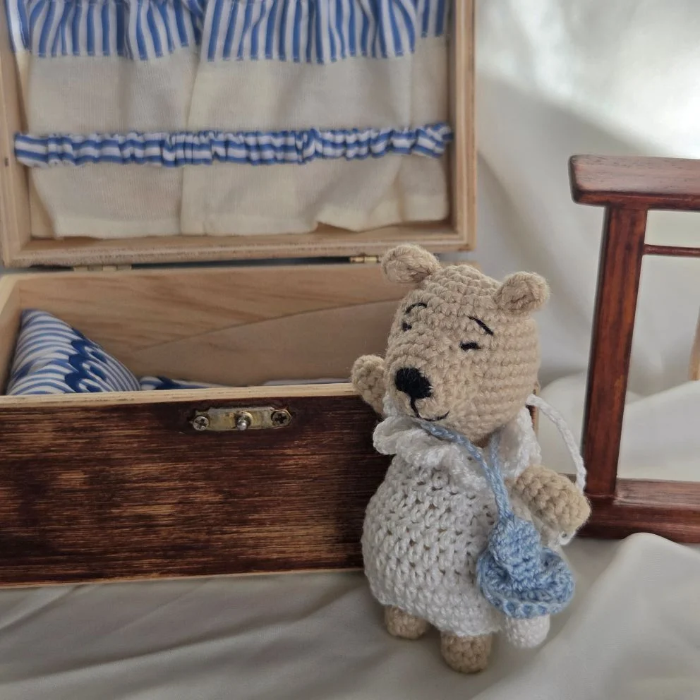Folkowe misie- czyli misie z tradycjami, ukołyszą Twoje dziecko do snu. Kompan zabaw i psot. Idealny na prezent dla dzieci. Zabawka miś Kajtek wykonany na szydełku. Zastosowano wkład hipoalergiczny. Pościel i poduszka uszyta z bawełny z zastosowaniem haftu komputerowego ze wzorem regionalnym OPOLSKI. Zestaw wraz z drewnianą skrzynką. W wewnątrz wieczka mini garderoba na ubranka.