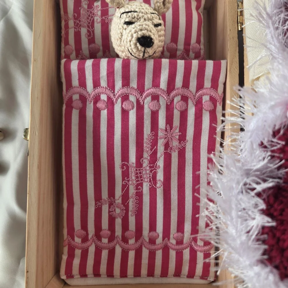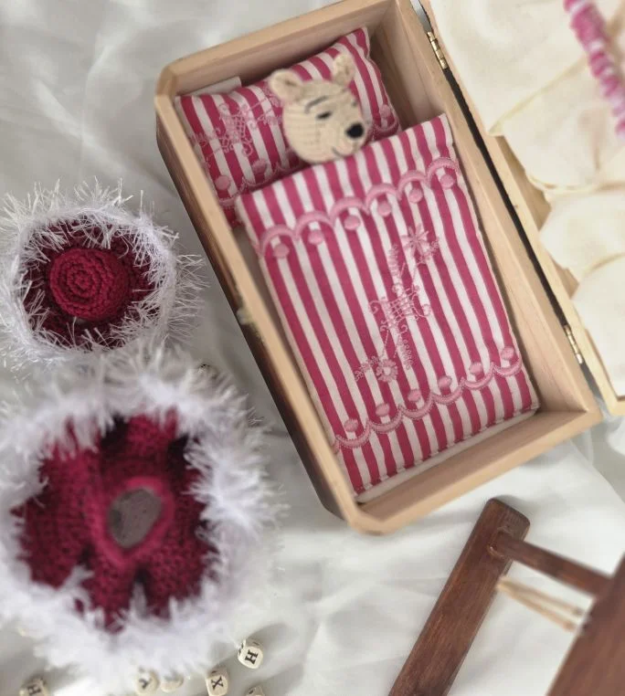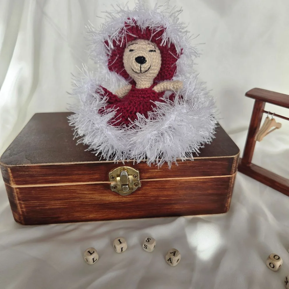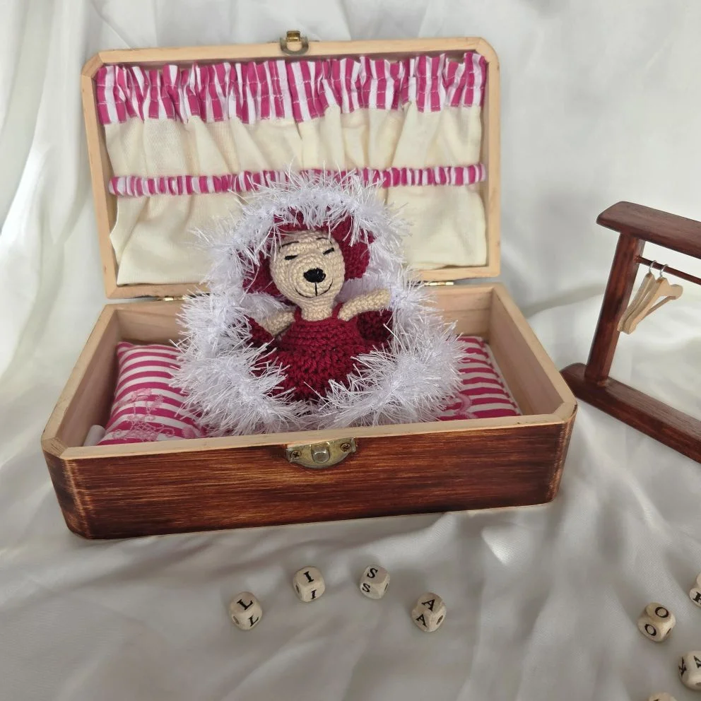 Folkowe misie- czyli misie z tradycjami, ukołyszą Twoje dziecko do snu. Kompan zabaw i psot. Idealny na prezent. Misia Lisa wykonana na szydełku. Zastosowano wkład hipoalergiczny. Pościel i poduszka uszyta z bawełny z zastosowaniem haftu komputerowego ze inspirowana wzorem regionalnym OPOLSKI. Zestaw wraz z drewnianą skrzynką. W środku wieczka mini szafa.