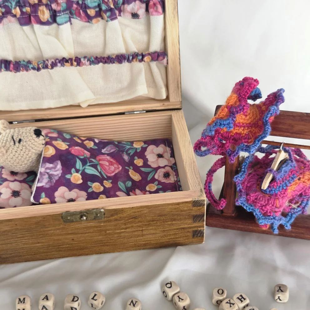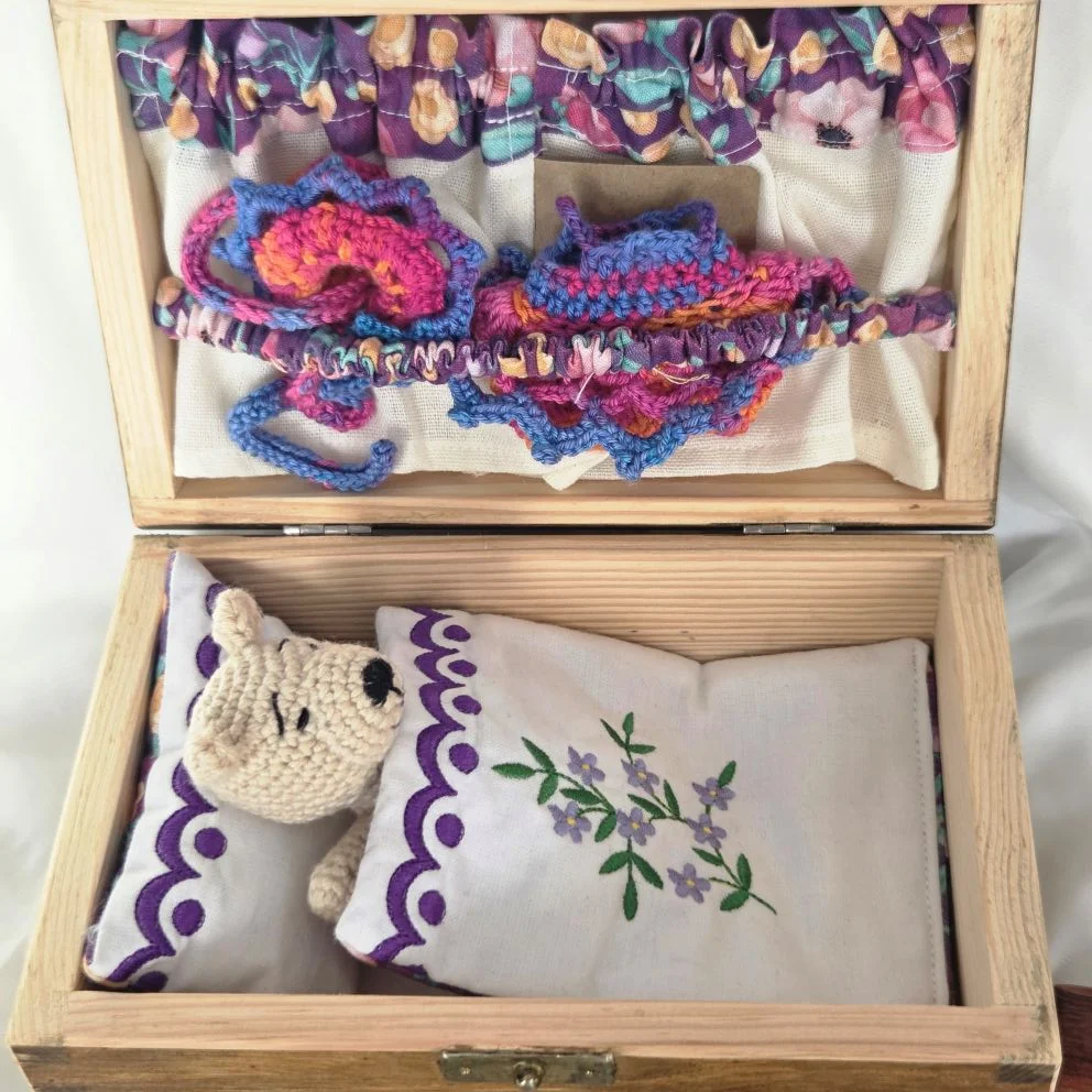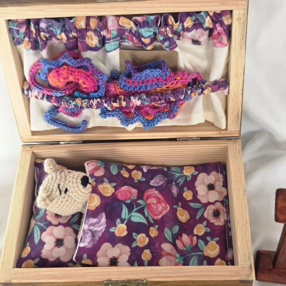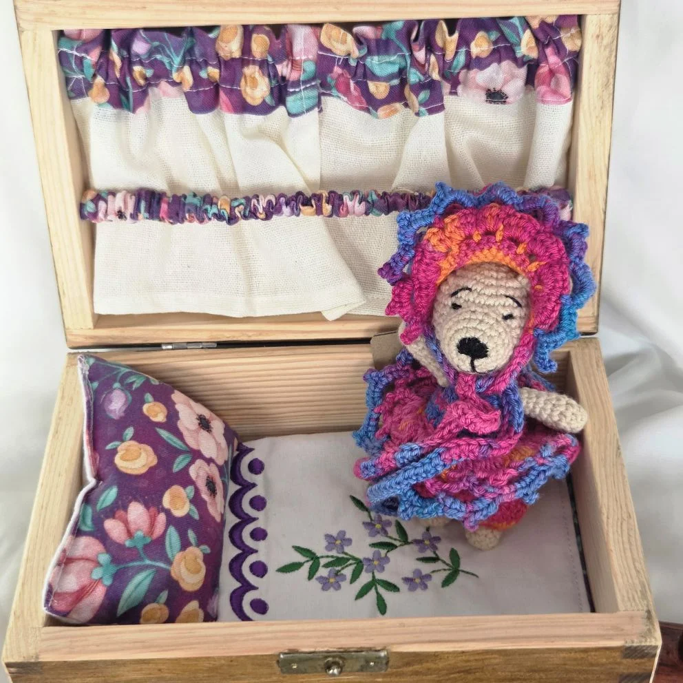 Zestaw wraz z drewnianą skrzynką. W wewnątrz wieczka mini garderoba na ubrania