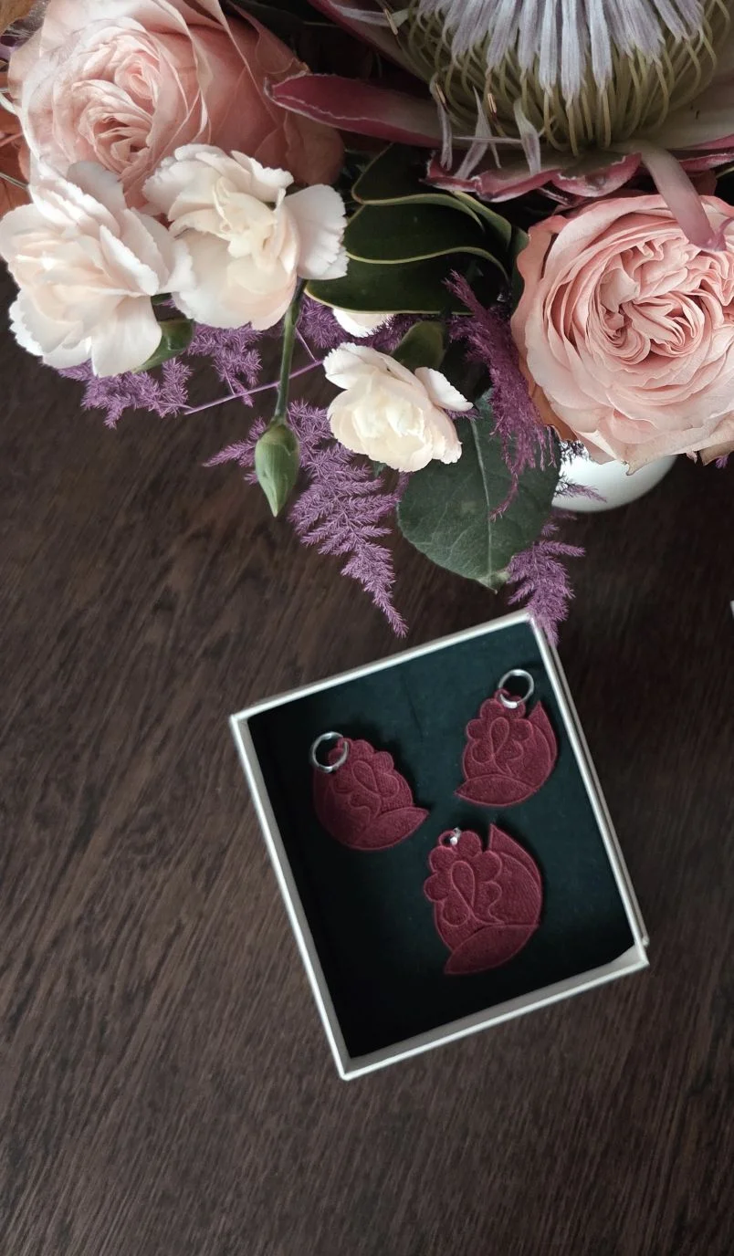 Mały zestaw koronkowej biżuterii, kolczyki i zawieszka. Te małe cuda zostały wykonane haftem maszynowym inspirowany wzorem haftu opolskiego w małej lokalnej pracowni. To idealny prezent na każdą okazję, który podkreśli Twoją troskę i uwagę wobec osoby, którą chcesz obdarować. Wybierz ten mały  zestaw prezentowy biżuterii i spraw, by Twój prezent był wyjątkowy i niezapomniany!
